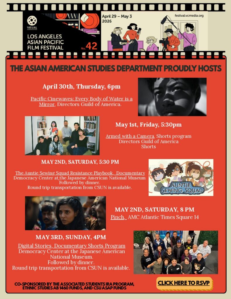 • May 2nd, Saturday, 5:30 pm: The Auntie Sewing Squad Resistance Playbook, Documentary Democracy Center at the Japanese American National Museum. Followed by dinner. Round trip transportation from CSUN is available.