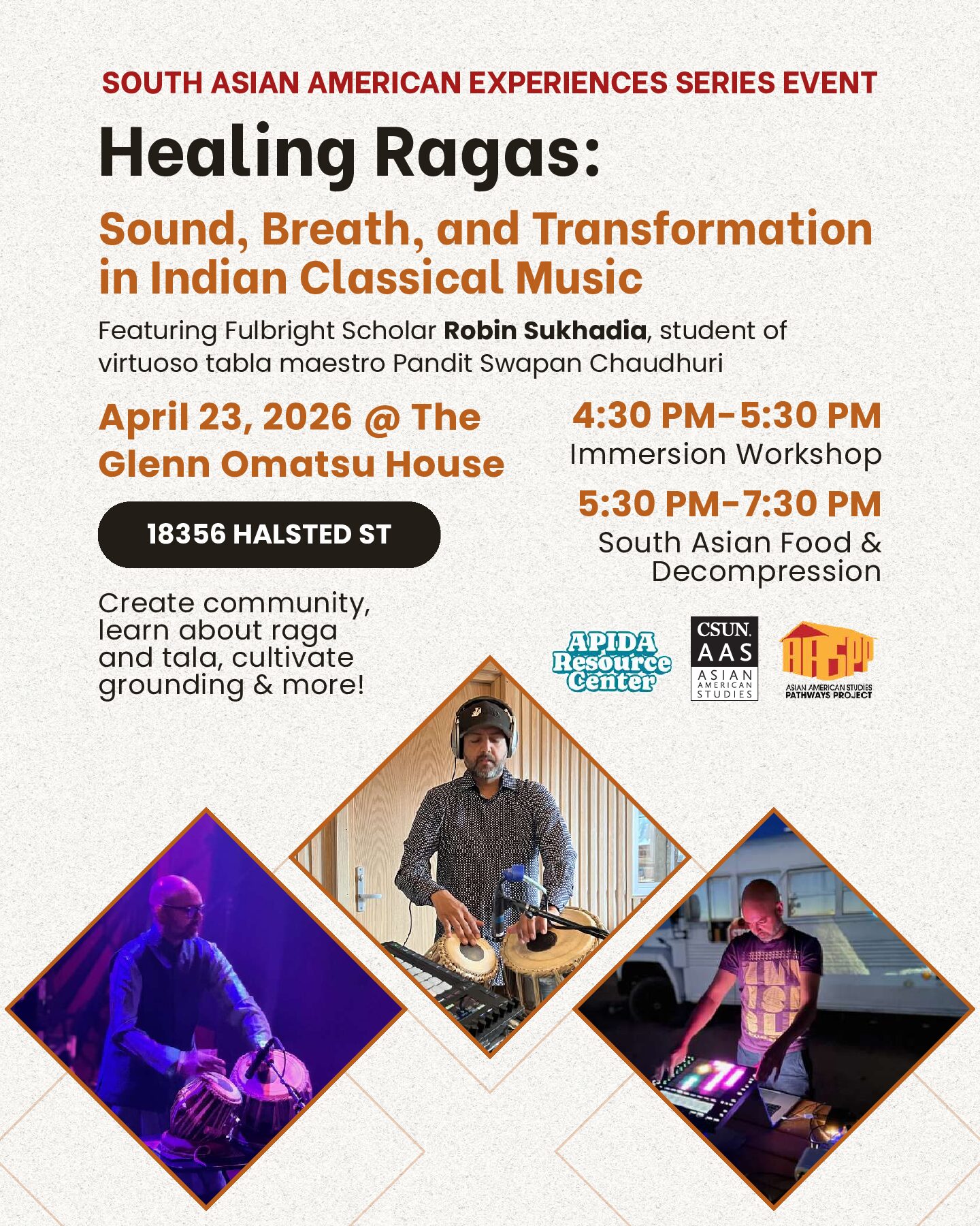 The Glenn Omatsu House 18356 Halsted Avenue, Northridge, United StatesFeaturing Fulbright Scholar Robin Sukhadia, student of virtuoso tabla maestro Pandit Swapan Chaudhuri April 23, 2026 @ The Glenn Omatsu House, 18356 Halsted Street 4:30 PM-5:30 PM Immersion Workshop 5:30… Continue reading Healing Ragas: Sound, Breath, and Transformation in Indian Classical Music