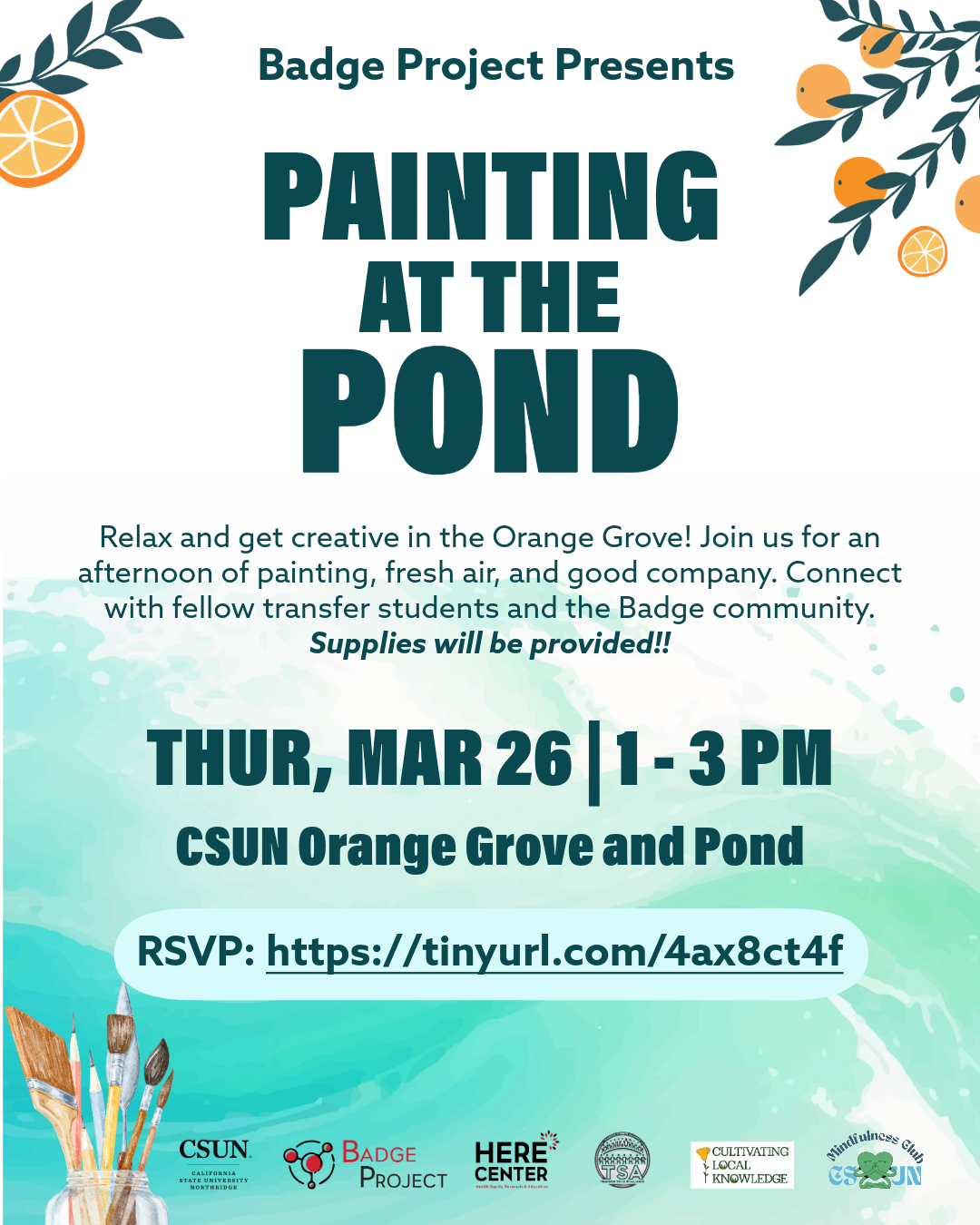Orange Grove Orange Grove Pond, Northridge, United StatesJoin us for Painting at the Pond, a relaxing and creative afternoon open to all CSUN students! After returning from spring break, take some time to unwind, mingle with fellow transfer students, and reconnect with the Badge community in a calm and welcoming outdoor setting. This is a great opportunity to build new connections, de-stress,… Continue reading Painting at the Pond